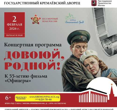 В преддверии Дня защитника Отечества, 2 февраля 2026 года в Государственном Кремлевском Дворце состоится концертная программа «Довоюй, родной!», посвященная 55-летию фильма «Офицеры» и Дню защитника Отечества.
